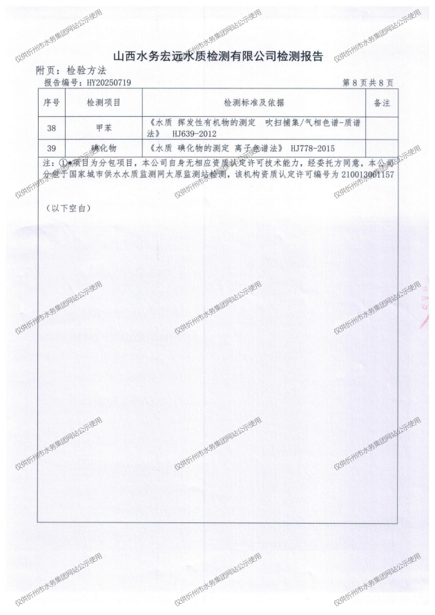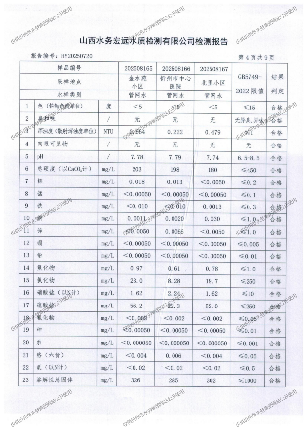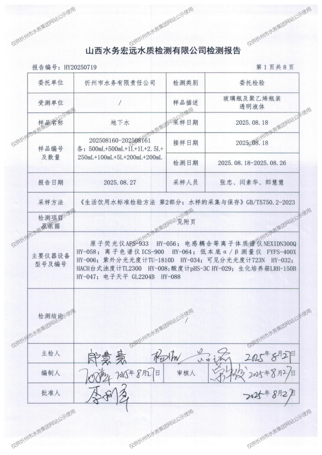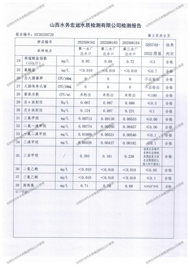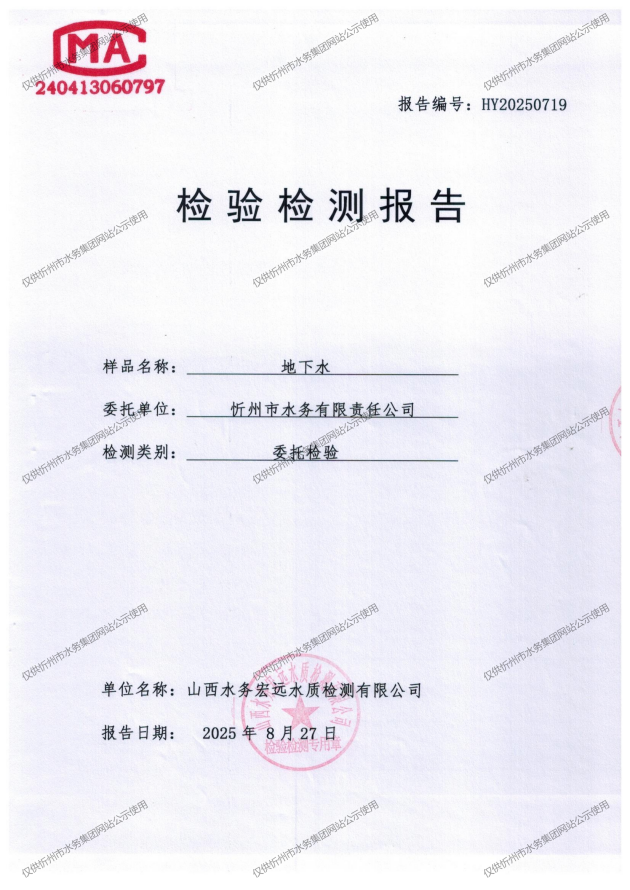 忻州城區(qū)公共供水水源水、出廠水、管網(wǎng)水、管網(wǎng)末梢水2025年8月份水質(zhì)信息公示