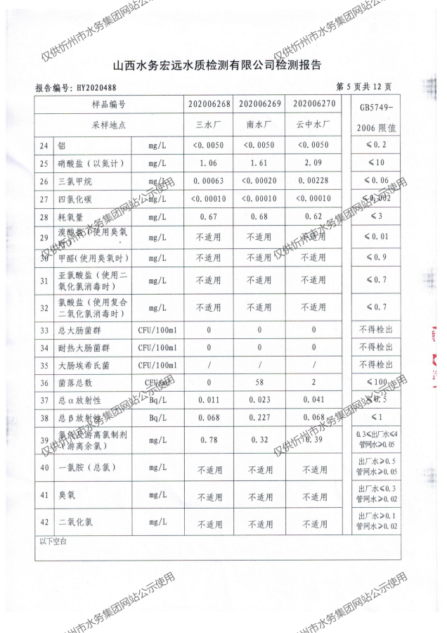 忻州城區(qū)公共供水水源水、出廠水、管網(wǎng)水、管網(wǎng)末梢水2020年7月份水質(zhì)信息公示