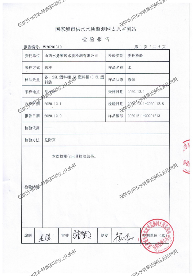 2020年忻州城區(qū)公共供水南水廠、三水廠、云中水廠出廠水106項水質全分析
